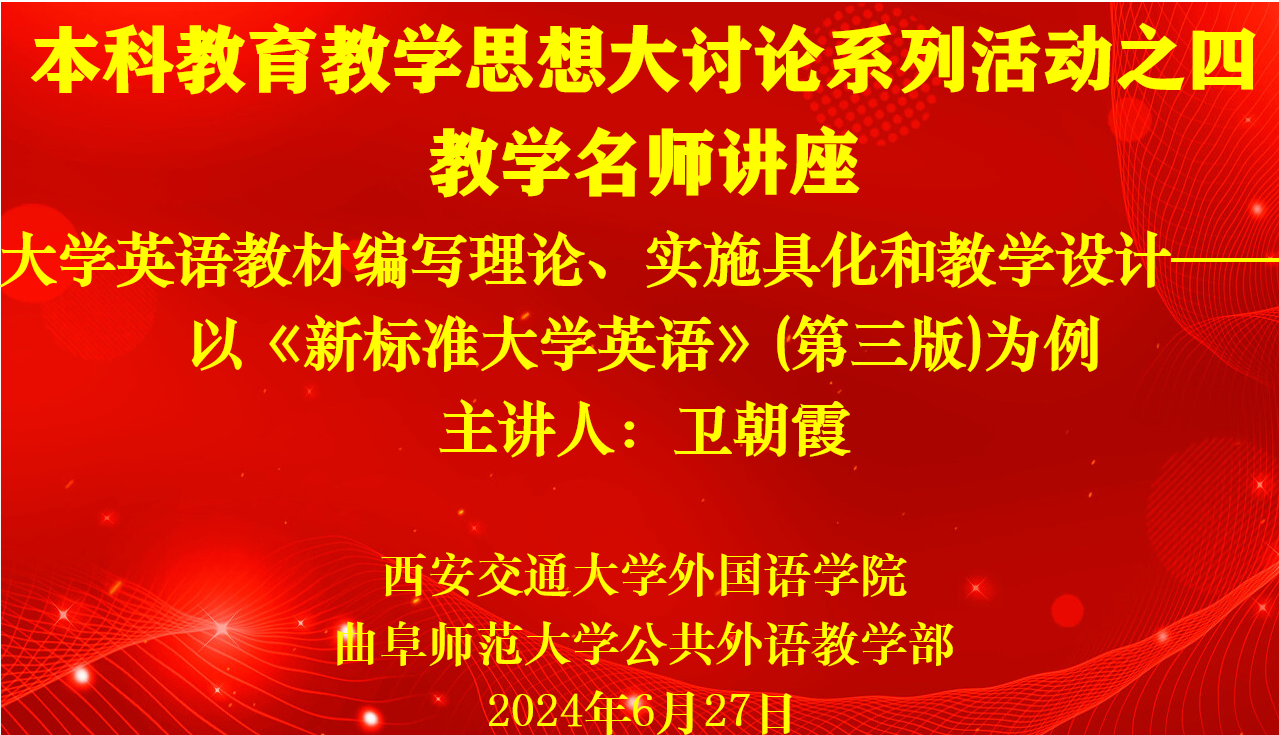 6月27日,玩球通(中国)举办本科教育教学思想大讨论系列活动之四:教学名师讲座,特别邀请西安交通大学外国语学院卫朝霞副教授作题为“大学英语教材编写理论、实施具化和教学设计——以《新标准大学英语》(第三版)为例”的专题报告。活动由玩球通(中国)主任王福祥主持,两校区全体教师参加了本次报告会。