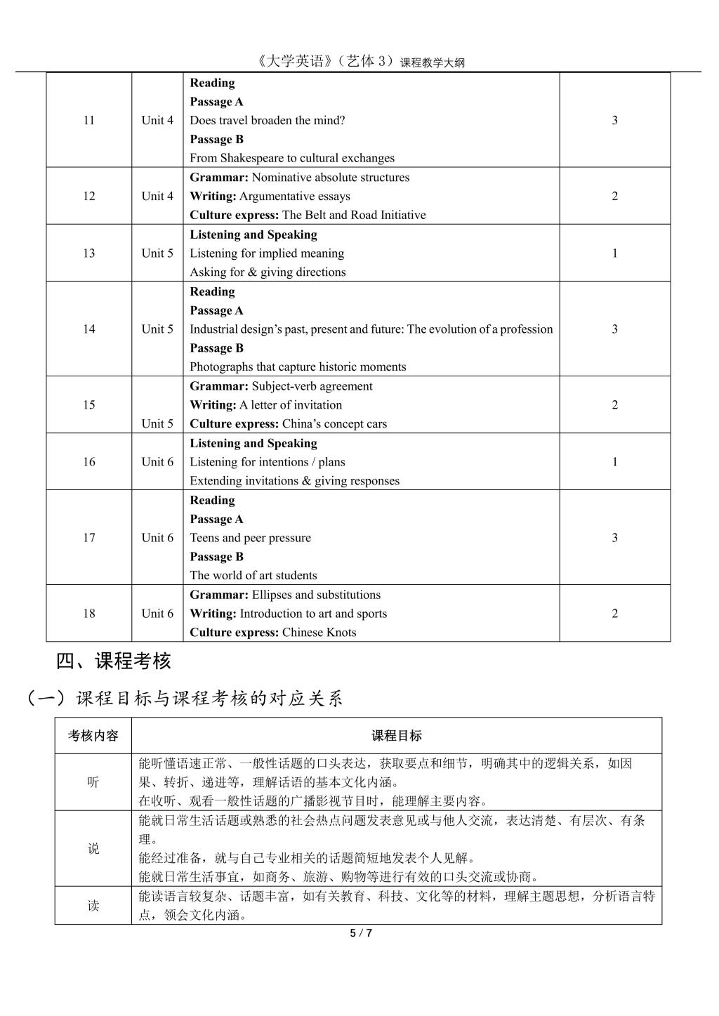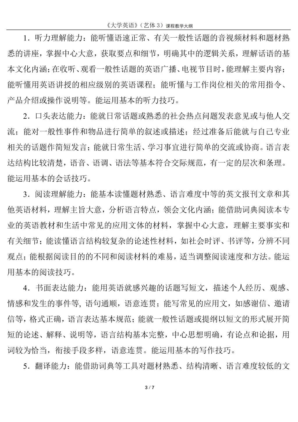 大学英语3(艺体)课程教学大纲(2022版)