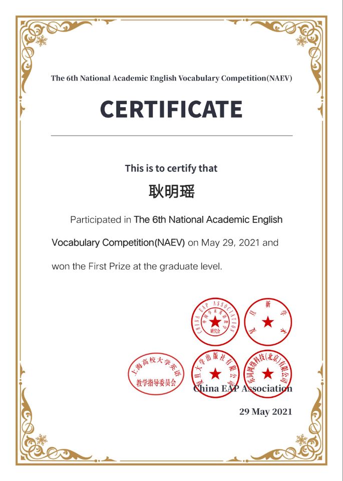 近日,由中国学术英语教学研究会、上海高校大学英语教学指导委员会、复旦大学出版社主办,曲师大玩球通(中国)和曲园学术英语社团承办的“第六届全国大学生学术英语词汇竞赛”圆满结束。继去年我校两名学子获全国一等奖后,本次大赛,十名曲园学子再次获得全国一等奖。