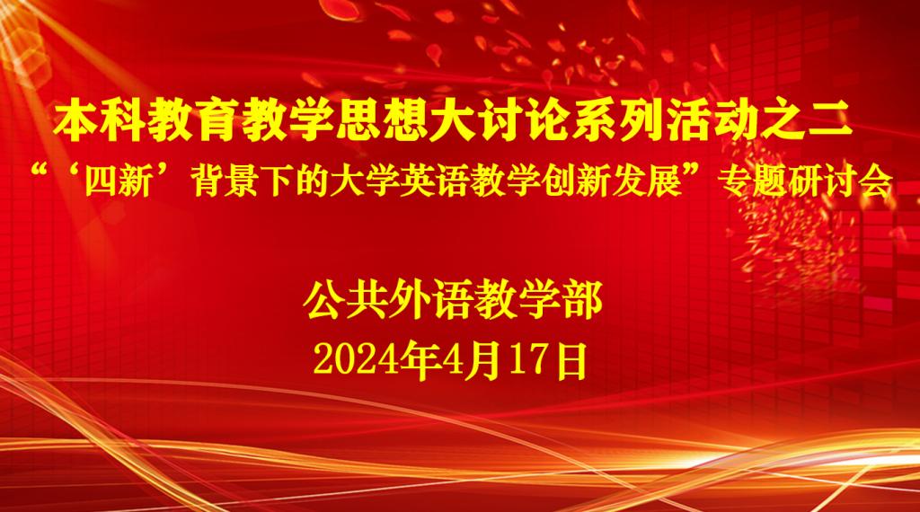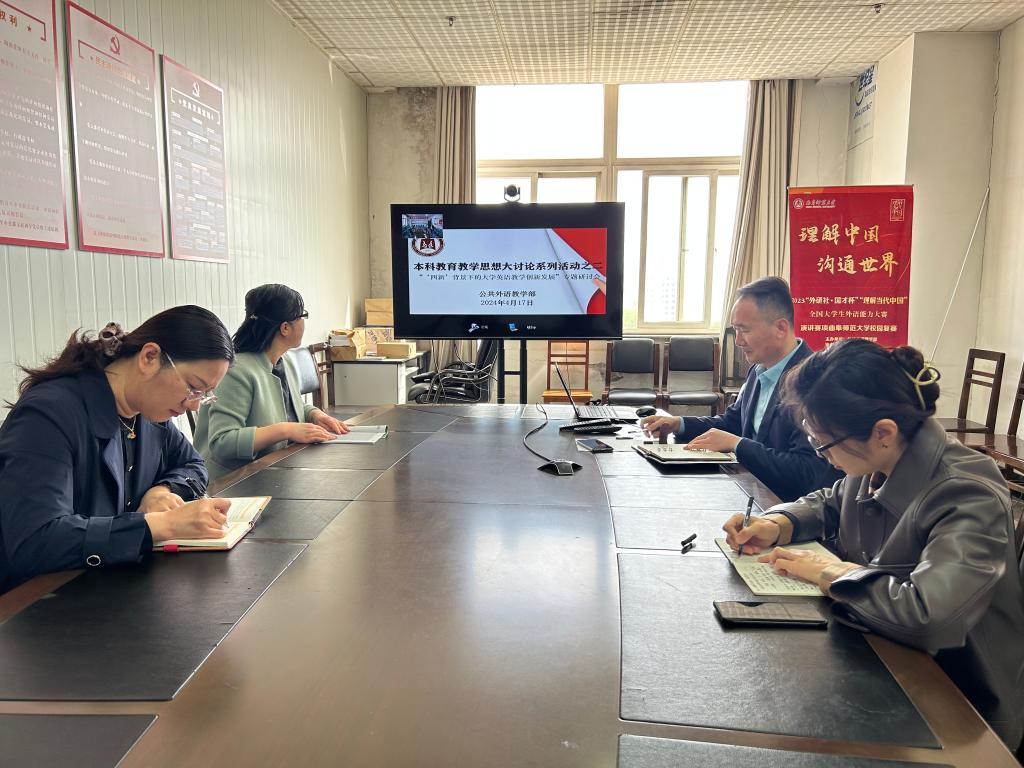 4月17日,玩球通(中国)召开本科教育教学思想大讨论系列活动之二——“‘四新’背景下的大学英语教学创新发展”专题研讨会。研讨会由玩球通(中国)主任王福祥主持,教学部领导班子全体成员和两校区教研室主任等业务骨干参加了本次研讨。