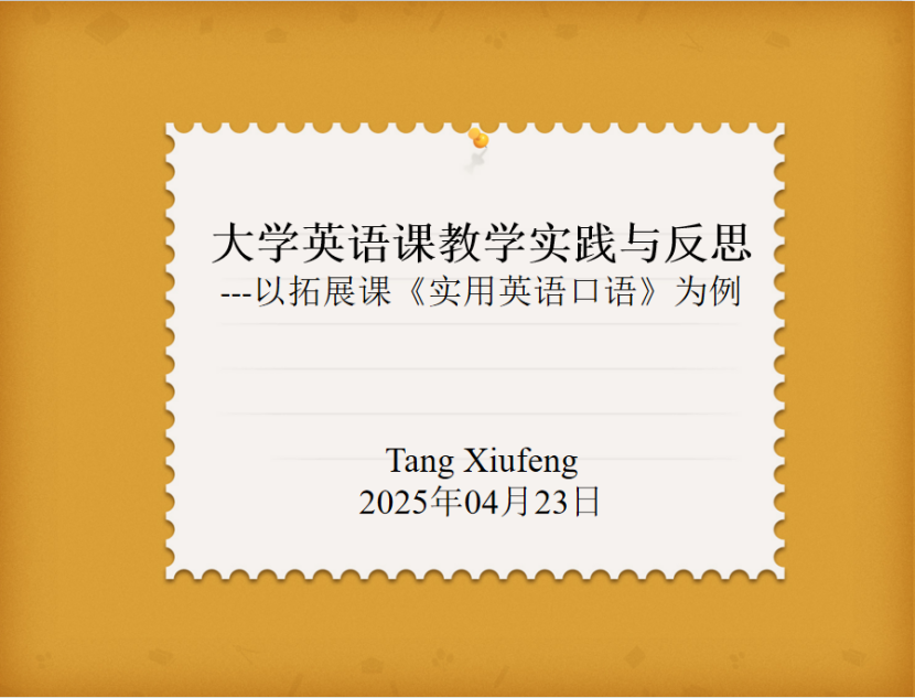 2025年4月23日,玩球通(中国)组织全员研训活动,聚焦大学英语教学实践与反思主题。活动中,唐秀峰老师以拓展课《实用英语口语》为例,分享了自己的教学经验与教学反思,为在场教师带来了新思路和新启发。研训中,唐老师从教学准备、课堂管理、技术应用、学生互动和评估反馈等多个关键维度展开分享。